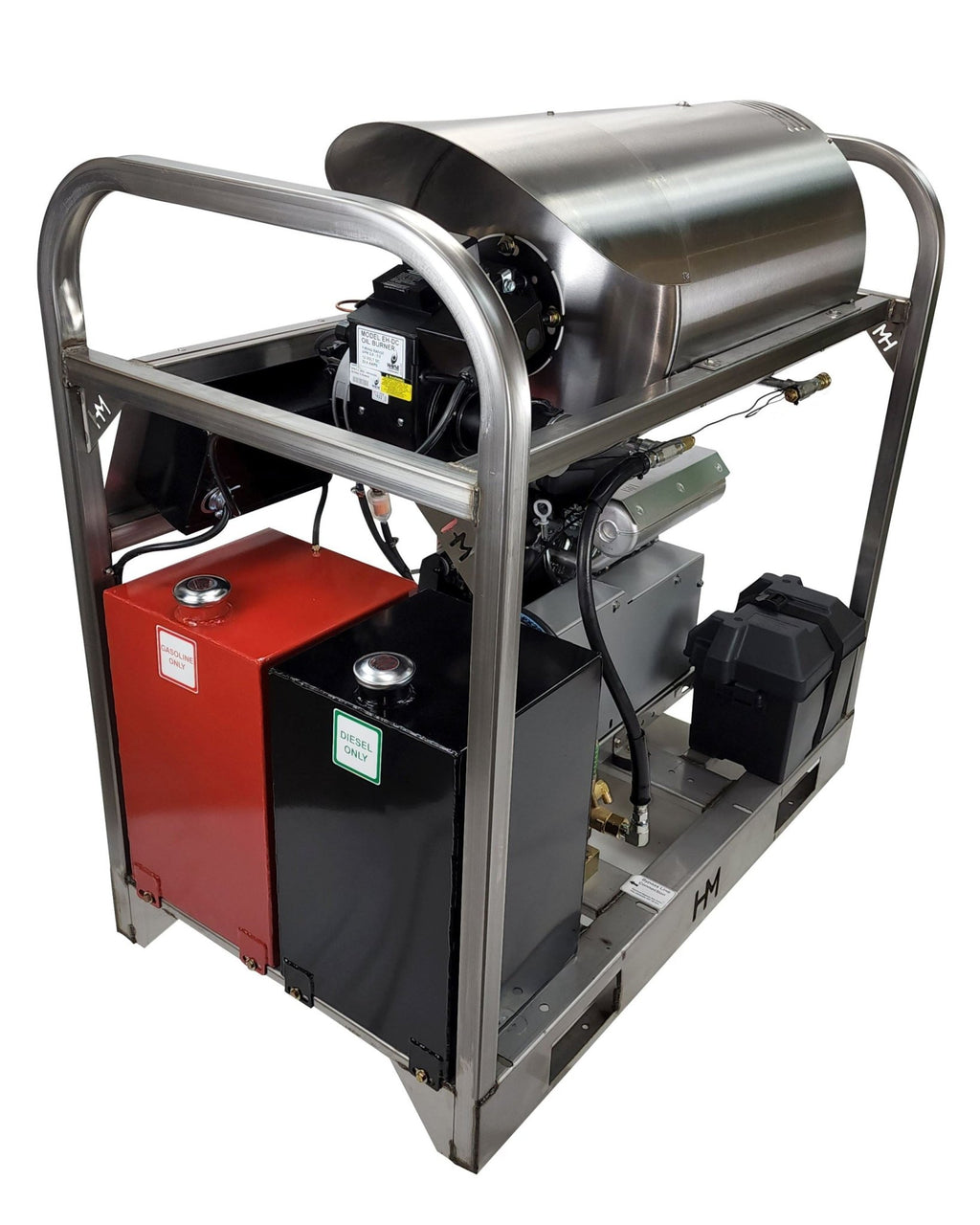 Honda GX630 Series Engine, Extreme Duty SS Frame, Weather tight electrical box, Belt drive General Pump, Stainless Steel Panels/Coil Wrap, Adjustable Thermostat,12V Burner, Hour Meter, 9.5gal Fuel Tanks, Easy Oil Drain, 50' 4000psi rated Non-Marking Hose, Chemical Injector, 48" Lance w/ GP Trigger Gun, QC Nozzle Set, High HP BX Belts. The DC Series also features large heater coils for excellent heat rise while still maintaining fuel efficiency. Unit dimensions Approx. 46" L x 48" H x 28" D