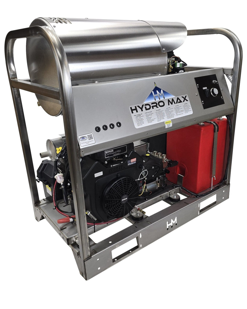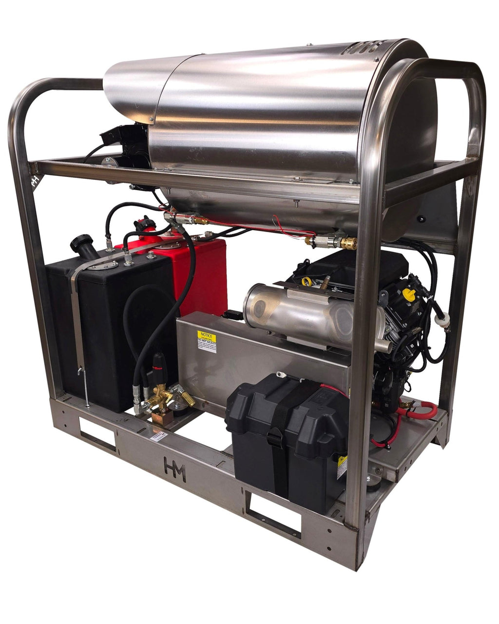 Kohler 26.5HP-EFI Engine ( Fuel Injected), Extreme Duty SS Frame, Weather tight electrical box, Belt drive Pump, Stainless Steel Panels/Coil Wrap, Adjustable Thermostat,12V Burner, 9.5gal Fuel Tanks, Easy Oil Drain, 50' 6000psi rated Non-Marking Hose, Chemical Injector, 48" Lance w/ GP Trigger Gun, QC Nozzle Set, High HP BX Belts. The DC Series also features large heater coils for excellent heat rise while still maintaining fuel efficiency. Unit dimensions Approx. 46" L x 48" H x 28" D
