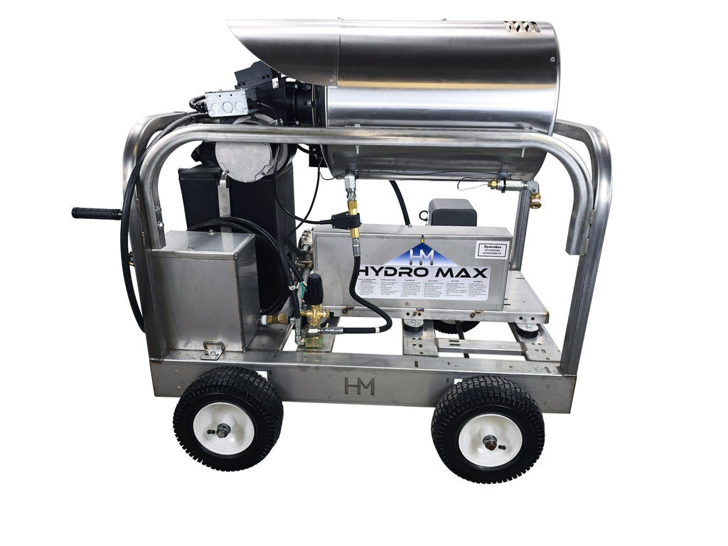 Hydro Max HMVE Series pressure washers are commercial grade units run on 240V single phase power. Units are also available with 3ph motors(special order). These units are built with heavy duty Square tube frames. The coil wrap/panels/frame are stainless steel. The HMVE Series comes standard with large 13" tires so that the units can easily be moved.