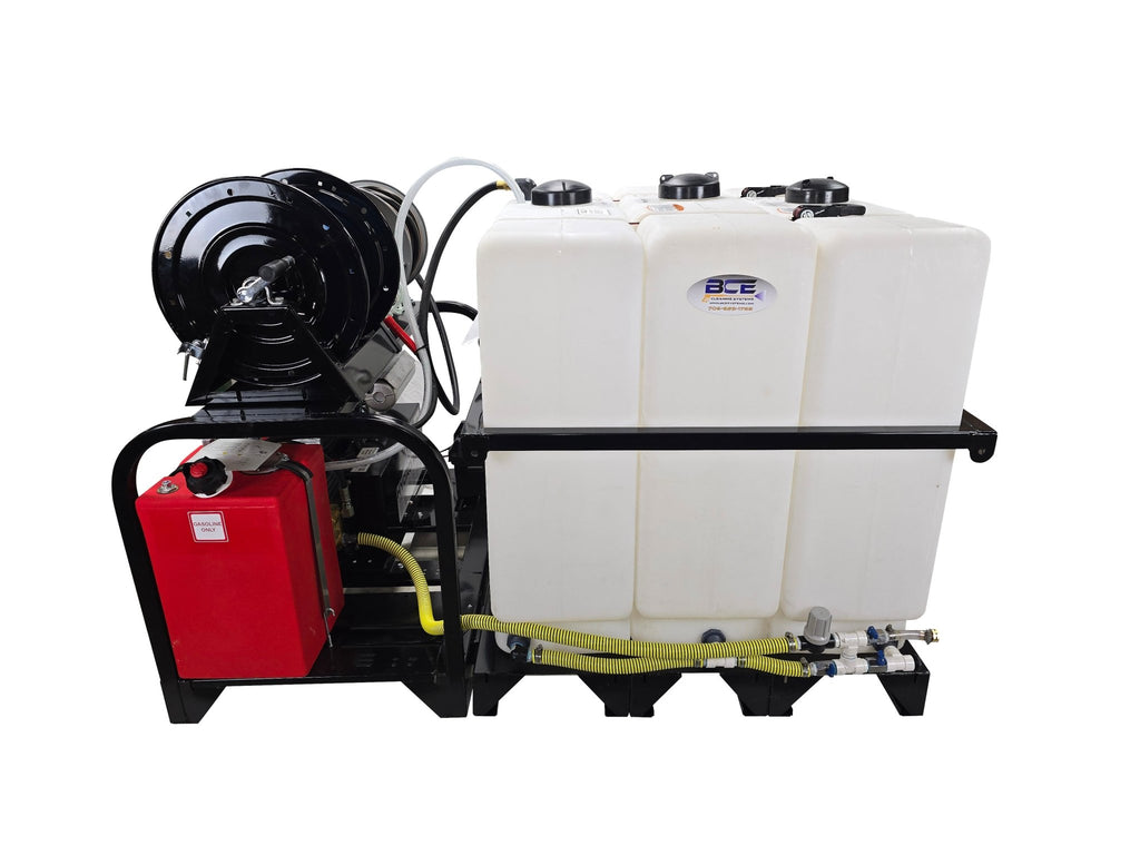 Hydro Max tank skids are complete pressure washer packages built into a compact frame. The units are like full trailer packages without the wheels and axles. Tank skids can be lifted using the integrated fork slots. Fork slots go through the entire unit so they can be safely lifted using a forklift with standard length forks.