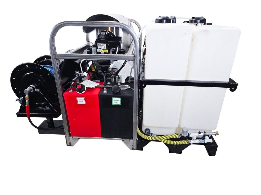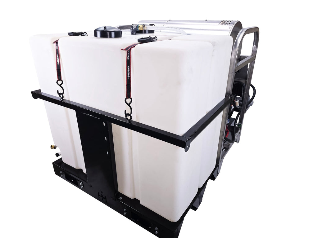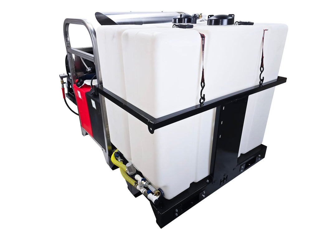 Hydro Max tank skids are complete pressure washer packages built into a compact frame. The units are like full trailer packages without the wheels and axles. Tank skids can be lifted using the integrated fork slots. Fork slots go through the entire unit so they can be safely lifted using a forklift with standard length forks.