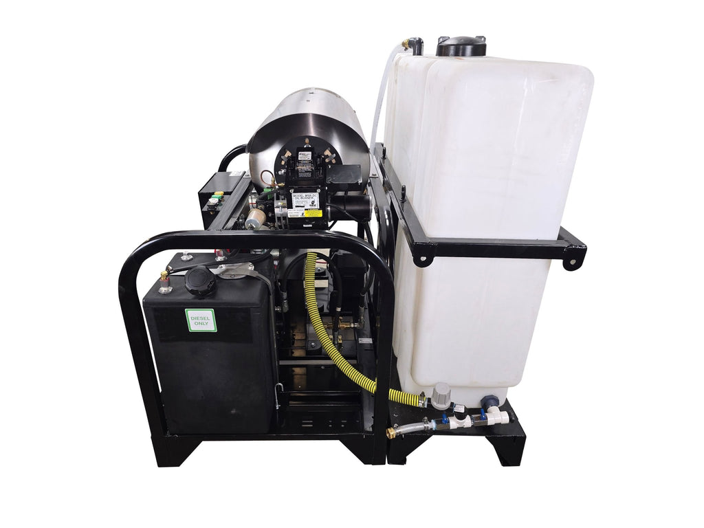 Hydro Max tank skids are complete pressure washer packages built into a compact frame. The units are like full trailer packages without the wheels and axles. Tank skids can be lifted using the integrated fork slots. Fork slots go through the entire unit so they can be safely lifted using a forklift with standard length forks.